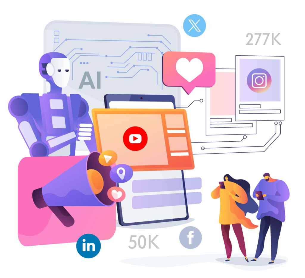 Artificial Intelligence (AI) is transforming social media marketing by helping businesses analyze audience behavior, generate content ideas, optimize posting schedules, and manage campaigns more efficiently.